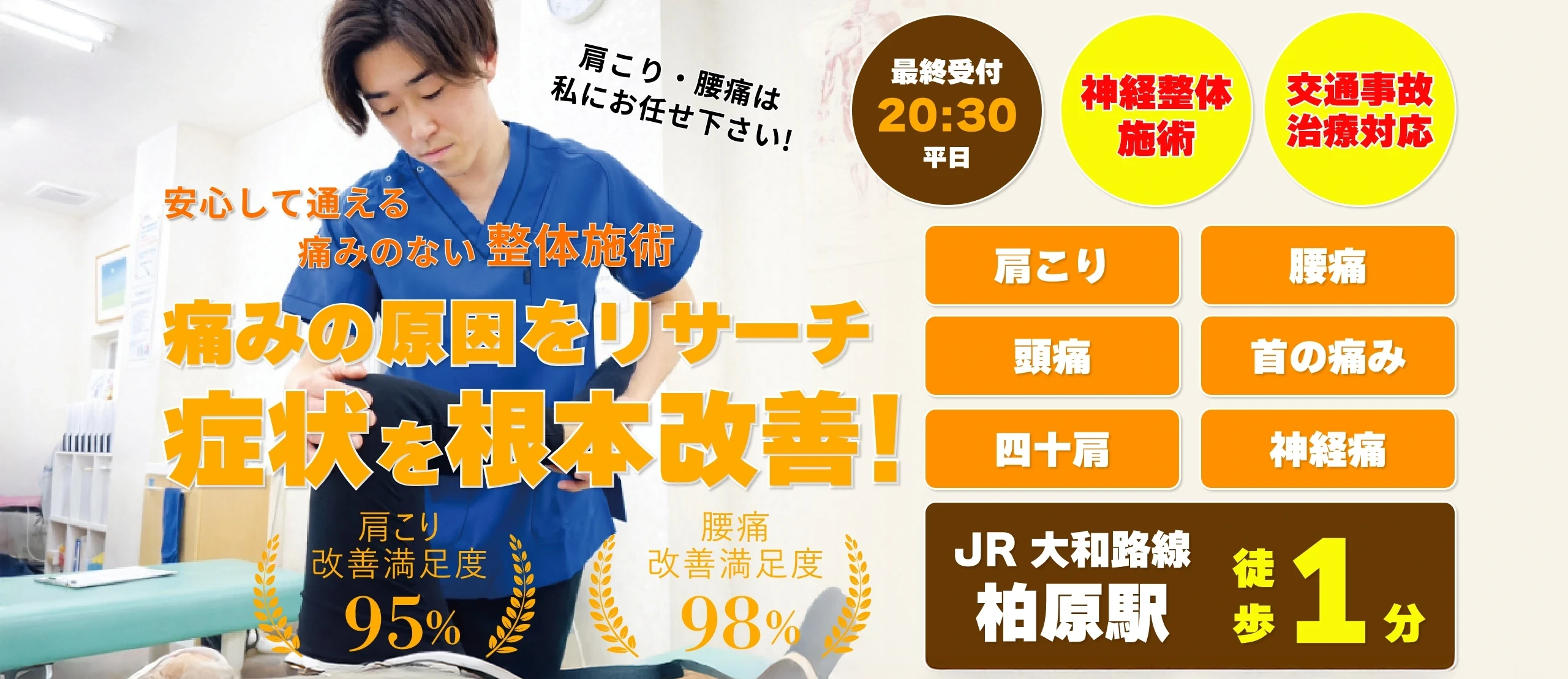 なかなか原因が分からずお身体のことでお悩みの方は、柏原尚門館整骨院で解消しましょう。